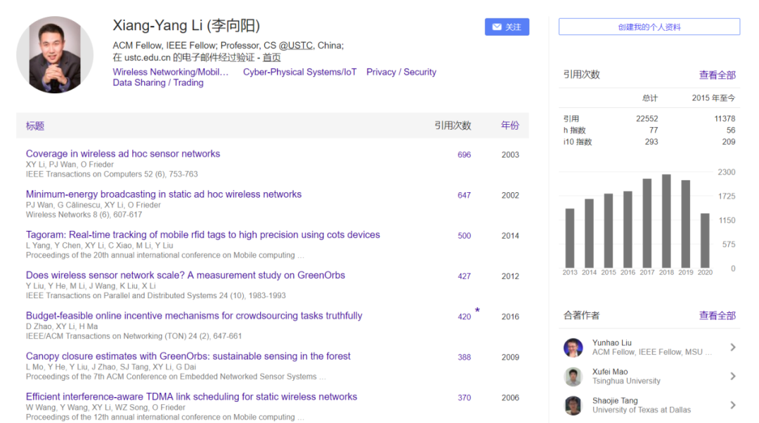 刘云浩与李向阳同年考入清华大学,刘云浩在自动化系,李向阳在计算机系,本科期间两人交集并不多;但两人殊途同归,进入了同一研究领域,几乎同一时间参与了INFOCOMM、MobiCom等学术会议的组织工作,并合作指导学生发表了多篇文章。在Google Scholar上查询李向阳,可以发现在合作伙伴一栏,排名第一的正是刘云浩。