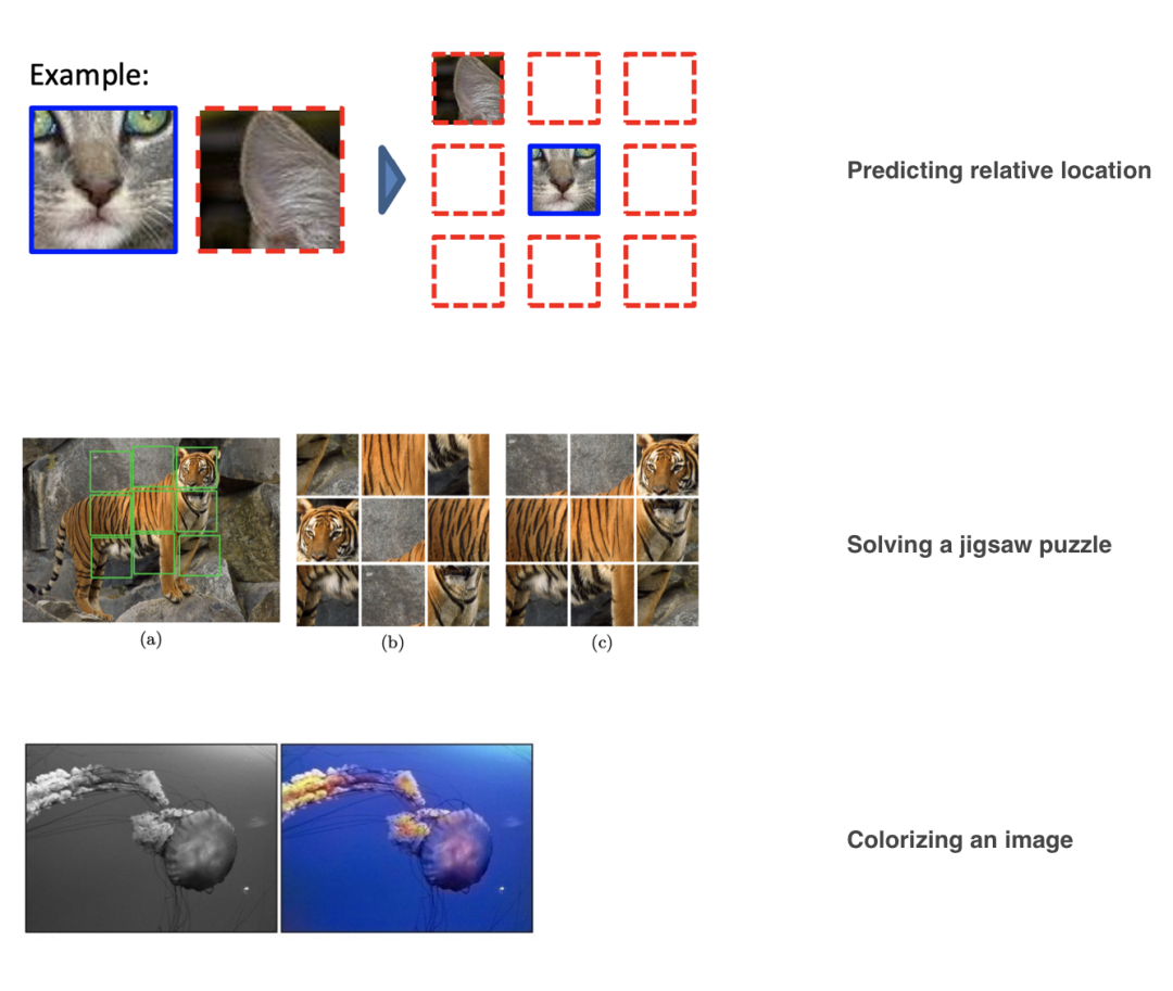 事实上,这种形式化定义是非常通用的,你可以创造性地对输入进行「分割」。这种策略被称为「前置任务」(又称「代理任务」),研究者们已经尝试了各种各样的方法。在这里,我们给出三种示例: