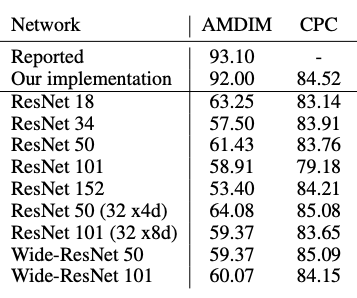 我们使用了 AMDIM 中的编码器,尽管使用任意其它编码器(如 ResNet-50)也有效。