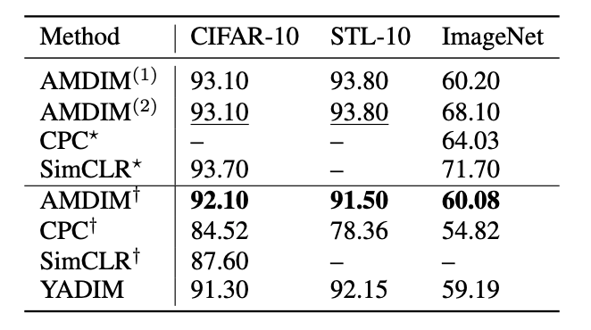 尽管我们唯一有意义的选择是:融合 AMDIM 和 CPC 的数据增强过程,但是相较于其它的方法,YADIM 仍然成功地取得了优秀的性能。