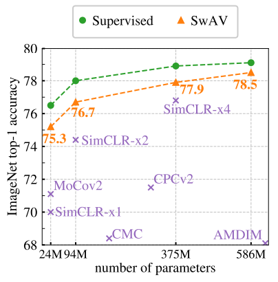 图 5:最新的方法(Swav)正在缩小与在 ImageNet 上训练的监督式方法的差距。