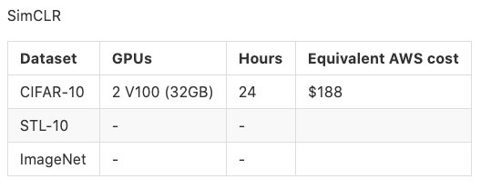 上述方法是使用大量计算资源训练出来的。高昂的计算开销意味着我们并没有进行严格的超参数搜索,而只是简单地使用了 STL-10 的超参数在 ImageNet 上进行训练。