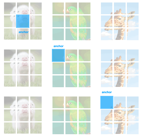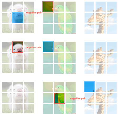 CPC 引入了应用色彩抖动、随机灰度、随机翻转等变换的处理流程,但是它也引入了一种特殊的变换:将一张图像划分为一些重叠的子图块。