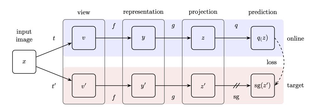 然而,BYOL 并不需要该分母,而是依赖于第二个编码器的权重更新机制来提供对比信号。然而,正如前文所述,近期的一些消融实验说明,实际上这可能并不是驱动对比信号的因素。