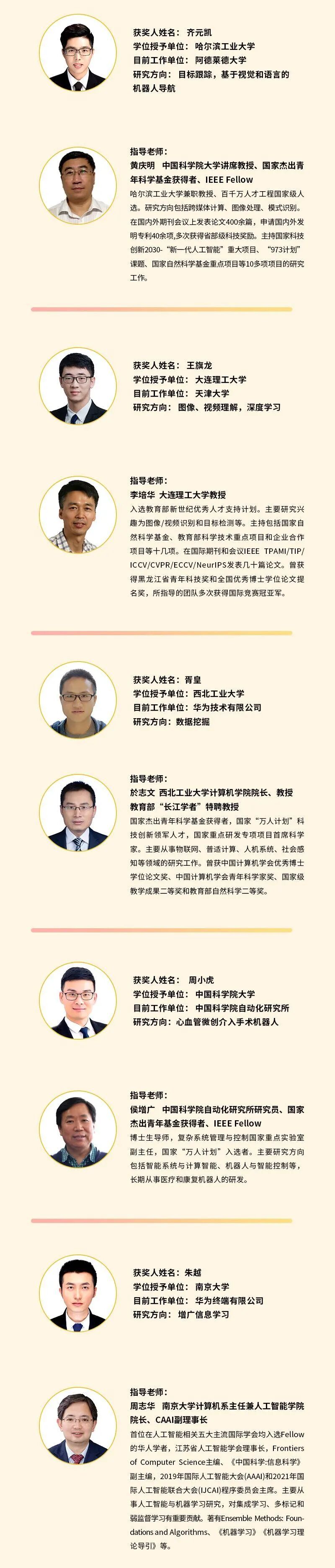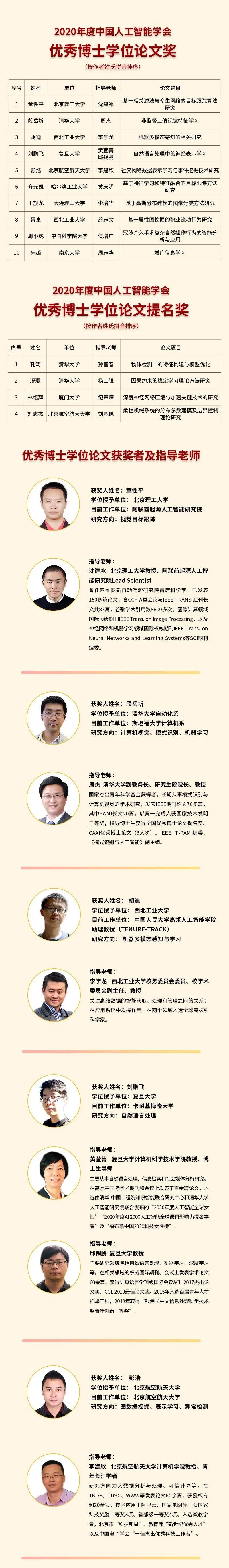 以下是2020年度中国人工智能学会优秀博士学位论文奖以及提名奖获奖名单: