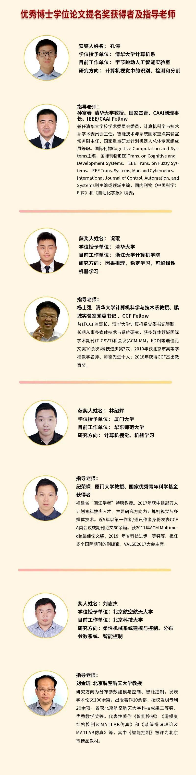 以下是2020年度中国人工智能学会优秀博士学位论文提名奖获得者及指导老师: