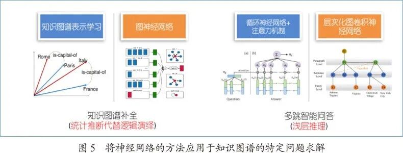 例如采用知识图谱表示学习(knowledge graph embedding)[1]、图神经网络(Graph Neural Networks,GNN)[2]等技术进行知识图谱的补全,其特点是用统计推理代替逻辑演绎;还有采用循环神经网络(Recurrent Neural Network,RNN)、图卷积神经网络(Graph Convolutional Network,GCN)等技术进行多跳智能问答[3],也是类似的工作,如图5所示。