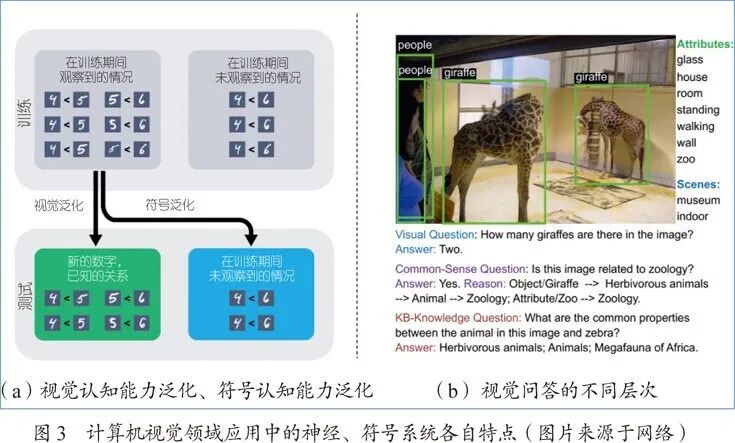 同样,在图3(b)的视觉问答例子中,神经系统可以轻松应对简单的视觉问答场景(如,图中有几只长颈鹿?),但是如果需要回答更复杂的问题(如,图中动物和斑马有哪些共同属性?),则必须借助外部的符号知识(如知识图谱)进行认知推理,才能完成求解过程。