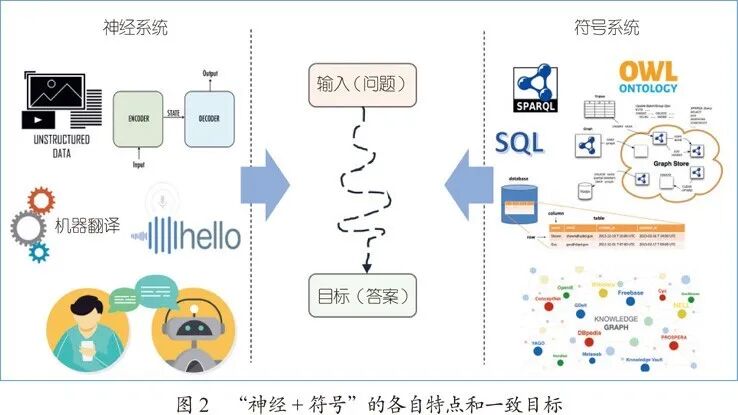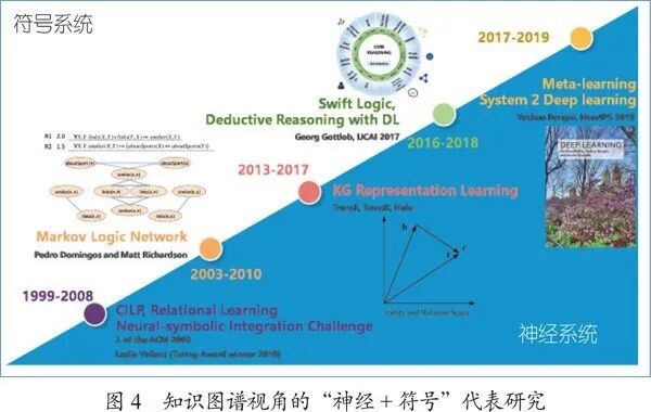 然而,实现“神经+符号”的有机结合并不容易。多年来,各个领域的人工智能研究者对此进行了大量研究。知识图谱作为近年来热门的人工智能研究方向,从早期的知识库、专家系统,到谷歌公司在2012年正式提出知识图谱,其发展历程也可以看作神经系统和符号系统各自的发展缩影,其中包括“神经+符号”结合的多次尝试,如图4所示。