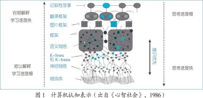 沿着这一点追溯,我们可以发现另一位ACM图灵奖得主马文·明斯基(Marvin Minsky)早于1986年在《心智社会》(The Society of Mind)一书中就清楚地阐述了人工智能和认知心理学(即System 1和System 2)之间的关系,并深入分析了人工智能中的神经系统和符号系统各自的特点和结合的可能,如图1所示。