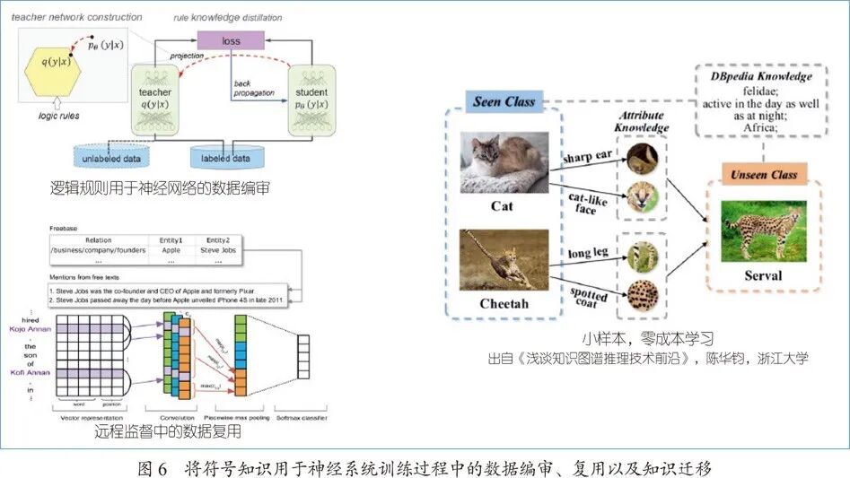 符号神经(symbolic for neural)这类方法的特点在于将符号的方法应用在神经网络的训练过程中。例如,使用逻辑规则在深度神经网络中进行数据的编审(data curation)[6];将知识图谱应用在远程监督、少样本、零样本的模型和场景中[7,8],如图6所示。