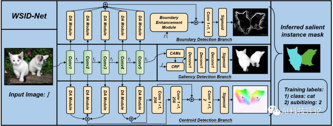 我们注意到,子实体化信息提供了对显著项数量的即时判断,这自然与检测显著实例有关,并且可能有助于在分组同一实例的不同部分的同时,分离同一类的实例。受此启发,我们提出使用类和子实体化标签作为SID问题的弱监督。并提出了一种新的具有三个分支的弱监督网络: