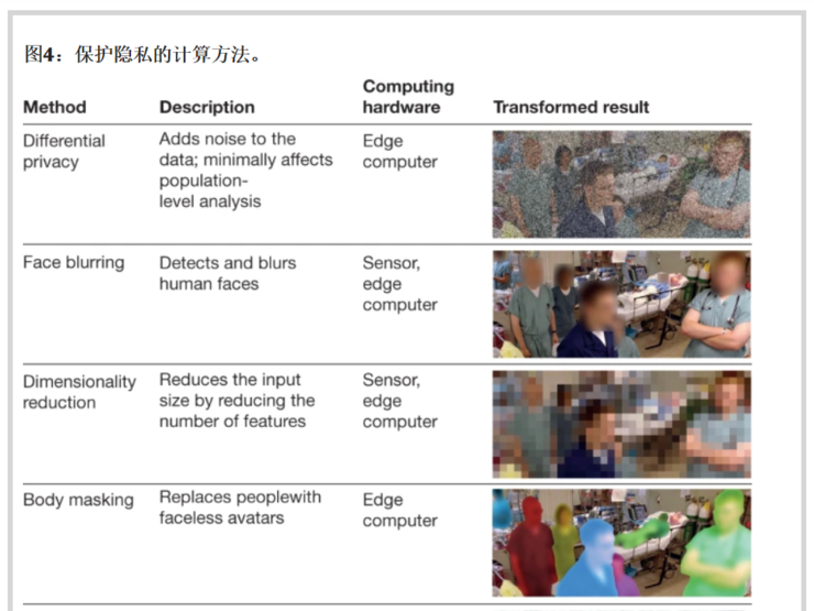 如图展示了一些现有的和新兴的隐私保护技术。一种方法是通过删除个体身份来反标识数据。另一种方法是数据最小化,它将数据捕获、传输和人员兼捕最小化。当一个病房无人时,环境系统检测可能会暂停,但即使数据被取消识别,也可以重新识别个体。超分辨率技术可以部分逆转面部模糊和降维技术的效果,从而有可能实现重新识别。这表明数据应保留在设备上,以减少未经授权访问和重新识别的风险。