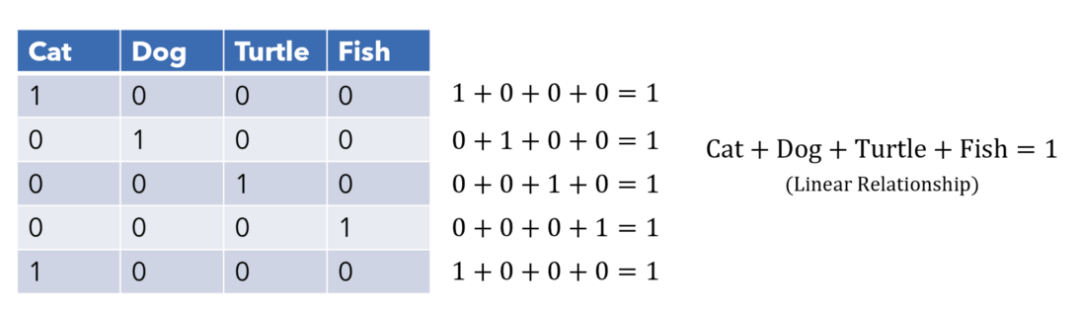 更糟糕的是,每个信息稀疏列之间都具有线性关系。这意味着一个变量可以很容易地使用其他变量进行预测,导致高维度中出现并行性和多重共线性的问题。