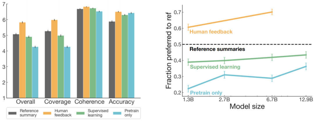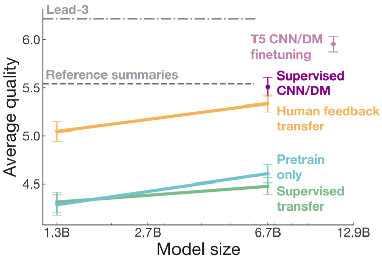 2、迁移实验结果:尽管模型从未学习过新闻领域的摘要生成,模型依然在新闻类数据集CNN/DM上取得了很好的表现。如下图所示,在模型规模相等的情况下,TL;DR上强化学习后的模型(Human feedback transfer)与直接在CNN/DM上fine-tune过的模型(Supervised CNN/DM)相比,评测结果相差无几。