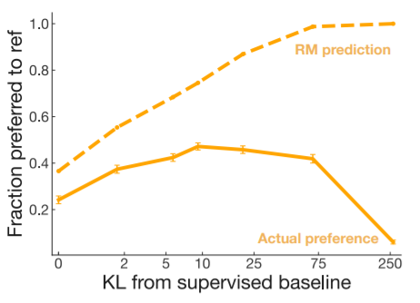 我们也看到,在进行强化学习时的奖励并非直接由reward model给出,还需要加一个相对熵限制项。并且从实验中的分析结果来看,模型训练似乎非常容易过拟合。可以想见整个调参过程应该是非常复杂的。