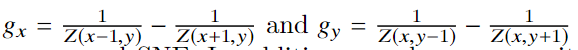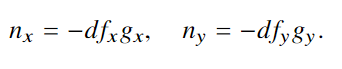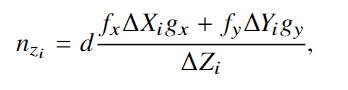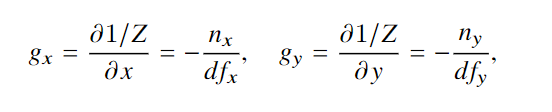 如图2所示,可以分别用水平和垂直图像梯度滤波器对反深度图像1 / Z(或视差图像与深度成反比)进行卷积来分别近似。对上面的式子进行变形,可以得到nx、ny的表达式: