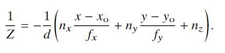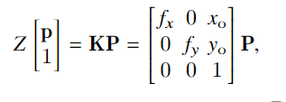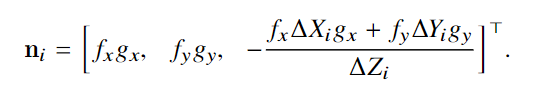其中,K是相机内在矩阵,(xo,yo)是图像中心;fx和fy是相机焦距(以像素为单位)。估计P表面的法线向量的方法是: