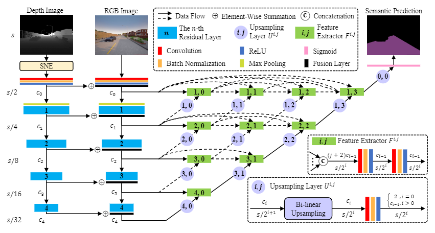 图1:SNE-RoadSeg的网络结构。它由SNE模块,一个RGB编码器,一个表面法线编码器和一个具有紧密连接的skip连接的解码器组成。s代表RGB的输入分辨率和深度图像。cn代表不同级别的特征图通道数。
