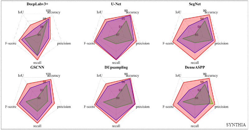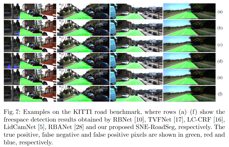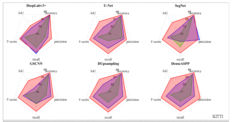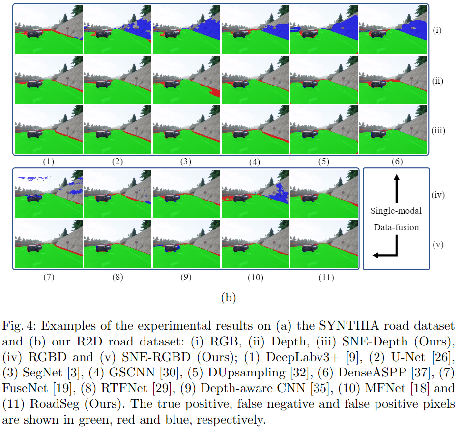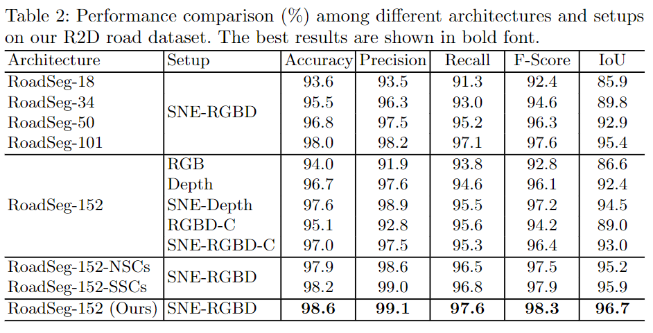 该部分使用这三个数据集来训练10个最先进的CNNs,包括6个单模态CNNs和4个数据融合CNNs。用三种设置来进行单模态CNNs的实验:a)用RGB图像进行训练,b)用深度图像进行训练,c)用表面法线图像(用本文的SNE来从深度图像中生成)进行训练,分别表示为RGB、Depth和SNE-Depth。同样,数据融合CNNs的实验也是使用两种设置进行的:使用RGB-D视觉数据进行训练,有嵌入和没有嵌入SNE,分别表示为RGBD和SNE-RGBD。为了比较提出的RoadSeg和其他最先进的CNNs之间的性能,用与数据融合CNNs相同的设置在三个数据集上训练RoadSeg。此外,还重新训练了SNE-RoadSeg,以便将结果提交给KITTI道路benchmark数据集上。