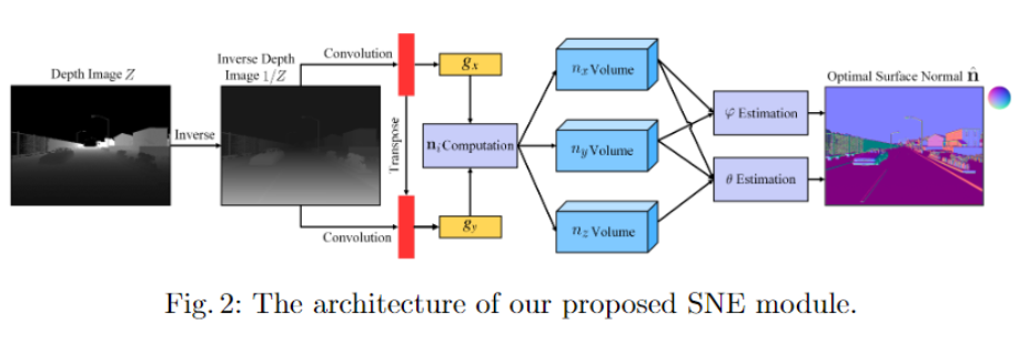 SNE是基于最近的工作《Three-filters-to-normal: An accurate and ultrafast surface normal estimato》(3F2N)开发出来的。其架构如图2所示。对于透视相机模型,可以使用以下公式将欧几里得坐标系中的3D点与2D图像像素点连接起来: