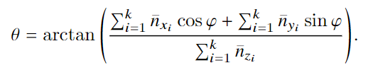 由于任何归一化表面法线都可以投影在中心为(0,0,0)且半径为1的球体上,因此最佳表面法线也可以投影在同一球体上的某个地方,用以下球坐标公式表示:
