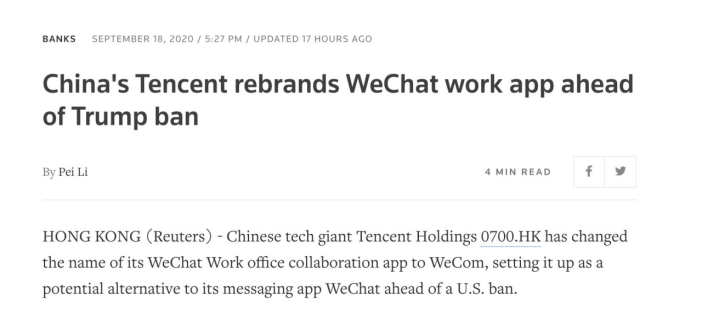 就在周日禁令前夕,据路透社报道称,腾讯将微信企业版应用程序由WeChat改为WeCom,欲在美国禁令生效之前将其设置为微信的潜在替代方案。