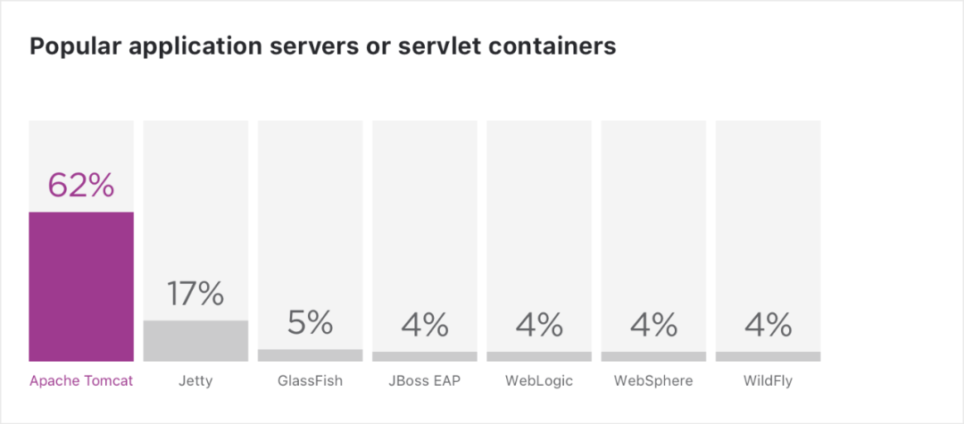 根据 2018 和 2020 年的数据显示,在过去的 3 年里,Apache Tomcat 一直是最受欢迎的应用服务器,而 JBoss EAP 和 WildFly 的使用量则减少了一半。