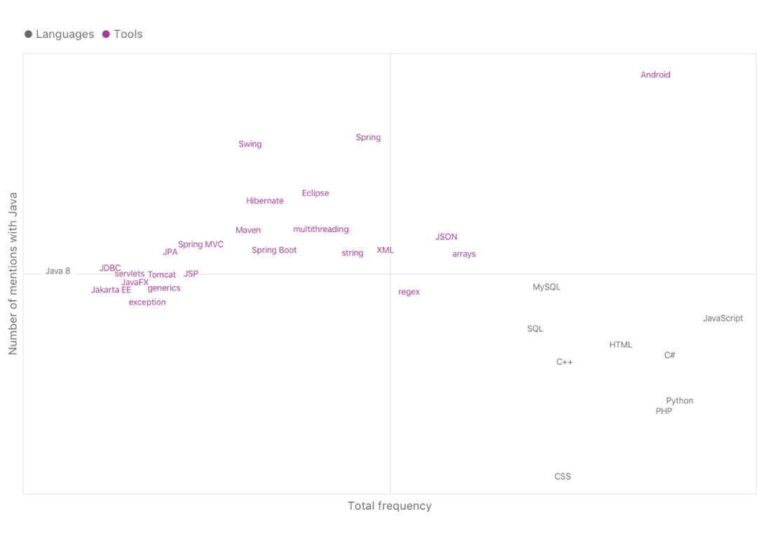 在 Stack Overflow 等 IT 社区中常常谈到 Java。JetBrains 从 stack overflow 社区的问答版本中提取数据,从而找出出现最多的「Java」标签。结果如下图所示,纵轴表示提及 Java 的标签,横轴表示标签出现的总数。