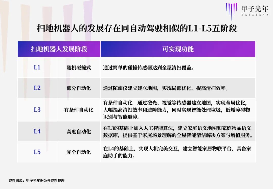 银星智能副总经理兼董事会秘书眭灵慧告诉「甲子光年」,扫地机器人是一个典型的“明天产品”,和无人驾驶一样可以分为五个阶段,当下市面上的扫地机器人都处于L1到L3阶段。当扫地机器人能实现L3到L4、L5的跨越,除了智能化程度和技术壁垒进一步提高,也伴随着单机价格的提升,这对于厂商来说意味着更高的毛利和更深的护城河,而银星在这方面的技术预研则有先发优势。