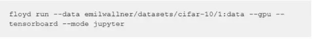 你可以通过"floyd run"命令进行不同的设置。在我们的案例中,我们希望: o 在FloydHub中增加一个已上传的公共数据集 o data emilwallner/datasets/cifar-10/1:data 指定数据目录。你可以在FloydHub上查看该数据集(以及许多其他公共数据集)。 o gpu 使用GPU云计算 o tensorboard 激活Tensorboard o mode jupyter Jupyter Notebook模式下运行任务 OK,开始运行我们的任务: