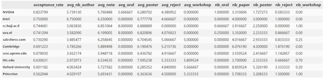 1. df_inst[df_inst.nb_paper > 3].sort_values(['acceptance_rate'],ascending=**False**).head(10)