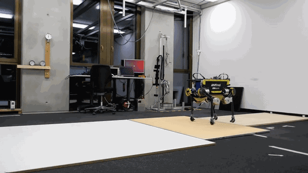 好,滑得好。但怎么转向呢?目前这个机器狗的前腿并不能支持常见的滑动转向,团队给出的解决方案也很有意思:原地踏步转向……