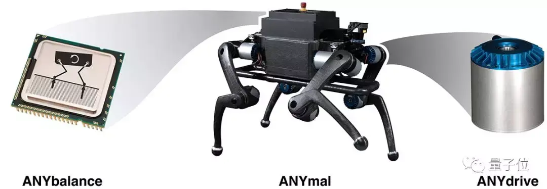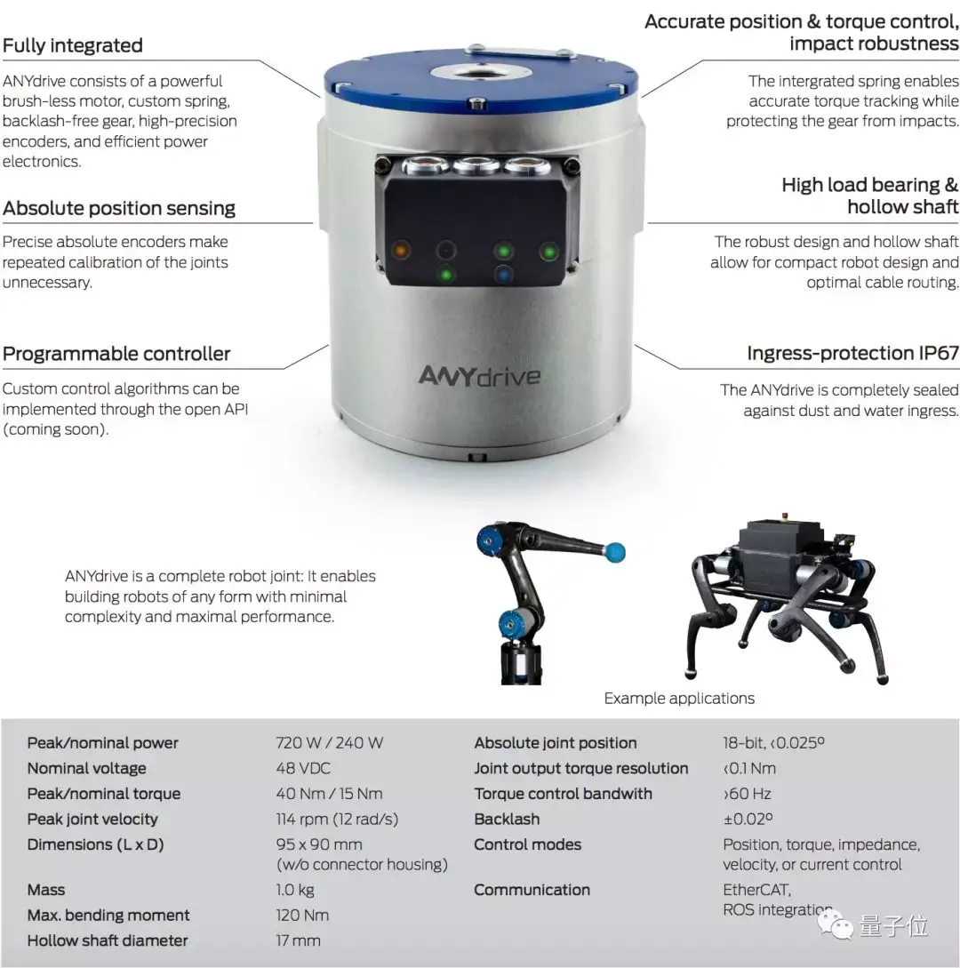 从右边开始说,那是一个高度集成的模块化机器人关节执行器ANYdrive,所有的电机、齿轮、钛弹簧、各种电子元件都集成在一个IP67级防护的密闭单元中。
