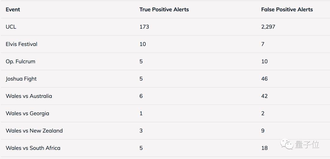 在威尔士与澳大利亚的橄榄球比赛中,正确识别6人,错误识别42人。误报率87.5%。