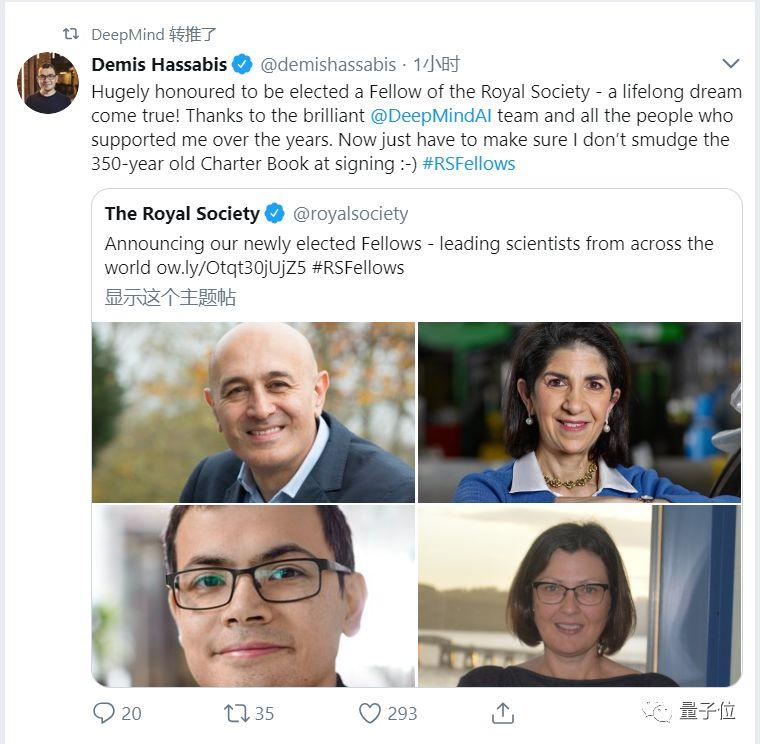 得知自己入选后,Demis Hassabis在社交网站上转发了这条消息,并且表示非常荣幸获得这一殊荣,成就了他毕生梦想,也感谢Deepmind团队的努力和支持,还谦虚的表示"瑟瑟发抖":希望我在签字的时候,不使这本拥有350年历史的名录受辱。