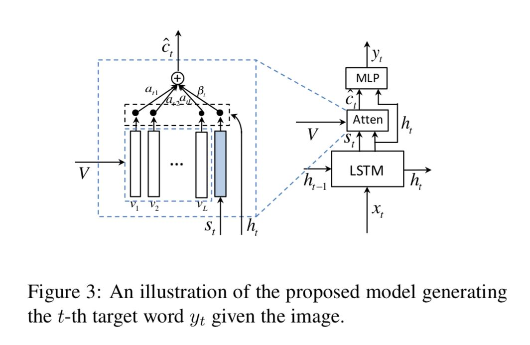 与 show, attend and tell [1] 使用 ht−1 的做法不同,本文使用的是 ht。结构如下:
