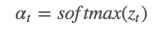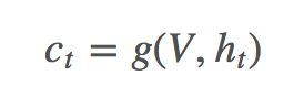 其中 g 是 attention function,V=[v1,...,vk] 代表 k 个区域的图像 feature,ht 是 t 时刻 RNN 的 hidden state。 由此可以得到 k 个区域的 attention 分布 αt: