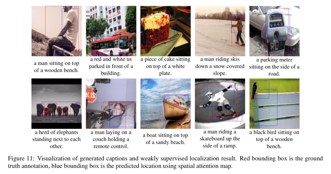Fig 11 显示了使用弱监督方法生成的 bounding box 与真实 bounding box 的对比。本文是第一个使用这种方法来评估 image caption 的 attention 效果的。