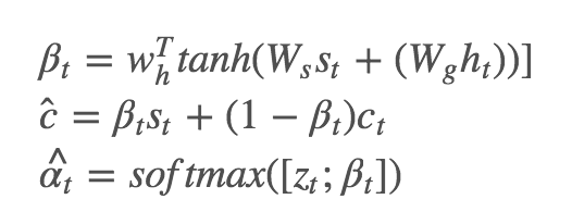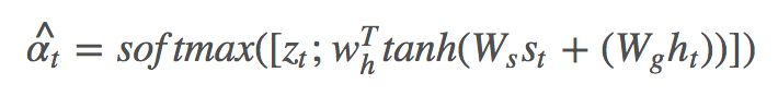 βt∈[0,1] 可以视为真正意义上的 sentinel gate,控制模型关注 visual sentinel 和 ct 的程度。与此同时,Spatial Attention 部分 k 个区域的 attention 分布 αt 也被扩展成了 αt^,做法是在 zt 后面拼接上一个元素: