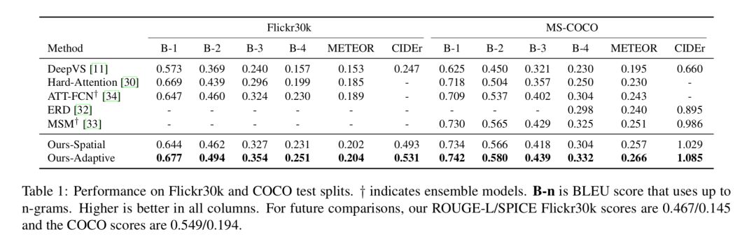 Table 1 在 test splits 上对比了在 Flickr30k 和 MSCOCO 数据集上模型与其他模型的表现,可以看到,模型的 Spatial Attention 部分就已经比其他模型表现好了,而加入了 Adaptive Attention 部分以后表现更加出色。