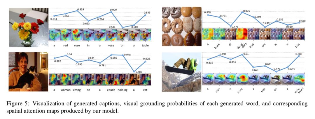 并计算生成的和真实 bounding box 的 IOU (intersection over union),对于 spatial attention 和 adaptive attention 模型,其平均定位准确率分别为 0.362 和 0.373。说明了,知道何时关注图像,也能让模型更清楚到底要去关注图像的哪个部分。