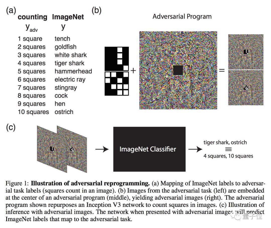 他们说,对抗攻击不仅能让图像识别模型认错图,还能对被攻击模型进行重新编程,让它们抛弃本职任务,去干一些由攻击者指定的,别的事情。他们将这种偷天换日指派的事情称为"对抗任务"。